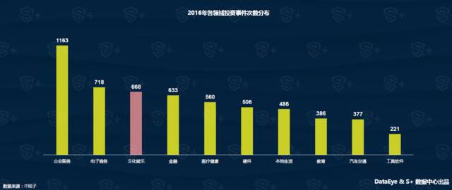 在资本市场上文化娱乐领域投资并购活跃。纵观2016年文化娱乐投资事件达到668件,行业活跃度依然保持前三位,并购规模和速度继续维持高热度,除了企业服务以外,文化娱乐细分领域二次元、移动电竞等新领域也将成为新的布局方向。