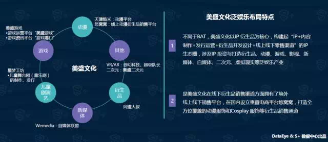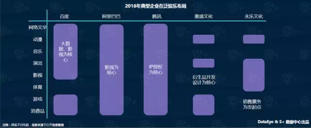 各企业在泛娱乐板块上布局各有侧重点。纵览泛娱乐产业全貌,目前形成了非常明显的竞争特点。一是以BAT为首的互联网巨头,依靠集团的生态和整体资源优势,通过战略投资或成立事业部门从而切入泛娱乐产业;二是传统设计制造衍生品的企业利用自身优势,往IP源头及相关泛娱乐形态布局;三是利用自身销售影视、演唱会等泛娱乐相关形态的线下销售票务经验,为IP商业化提供一系列技术服务从而切入泛娱乐产业。