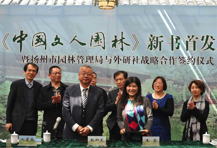 2017年3月26日,《中国文人园林》(中英对照)新书首发式在扬州个园举行;次日,同一本书的新书出版座谈会在如皋水绘园举办。特别今人关注的是,活动同期还举办了两场别具新意的战略合作签约仪式,代表了地方政府联合文化国企在开掘地方特色文化的最新尝试。其间,扬州市园林局、如皋市政府在活动现场分别与外研社达成了战略合作,共同致力于开掘以中国传统文人园林为代表的地方特色文化资源,通过市场化、产品化、服务化的方式,更好地向世界讲述中国故事,传播中国园林文化。