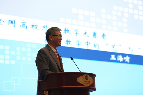教育部高等学校大学外语教学指导委员会秘书长王海啸教授从“外教社杯”全国高校外语教学大赛的角度对“英语教学中的‘艺’与‘术’”进行了解读。王海啸教授旁征博引,例证详实,通过教学大赛大量生动鲜活的实例把对教学的认知娓娓道来。教学不仅是门艺术,也是一门科学。它是一种创新,一种追求,一种激情,一种感受,一种自然,一种机制,也是一门系统工程,一种技能。