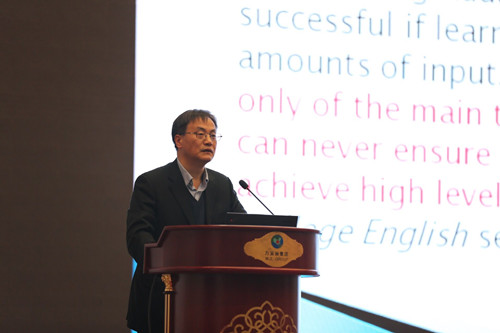 《外国语》主编、上海市英语教育教学研究基地首席专家、上海外国语大学束定芳教授主旨发言的题目为“大学英语教学:新目标与新途径”,重点阐释了《指南》对英语教学改革的新目标、新要求,并结合《新目标大学英语》教材的编写来说明对于《指南》通用英语课程、跨文化交际课程、专门用途英语课程的理解。