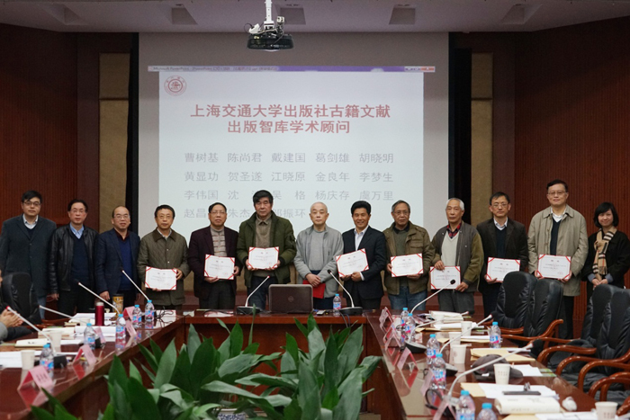 会上,举行了上海交通大学出版社古籍文献出版智库成立仪式。智库第一批专家共18位,交大社领导向到会专家颁发聘书并合影留念。