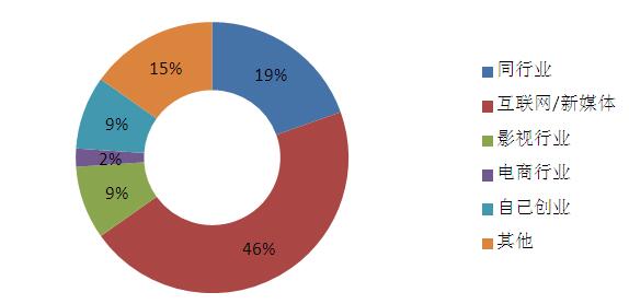 既然绝大多数数字出版从业者对自己的薪酬和状态均不满意,那他们的跳槽意愿又如何呢?所有数字出版从业者中有46人表示有跳槽意愿。本次调查从2015年的其他类中细分出了影视和电商行业,互联网和新媒体的意向占比有所下降,但46.00%仍是最为集中的领域;此外,留在出版业的占19.00%,选择其他的占15.00%,愿意投身影视行业的和选择自己创业的占比相同,均为9.00%,仅1人选择电商行业,占比约2.00%。