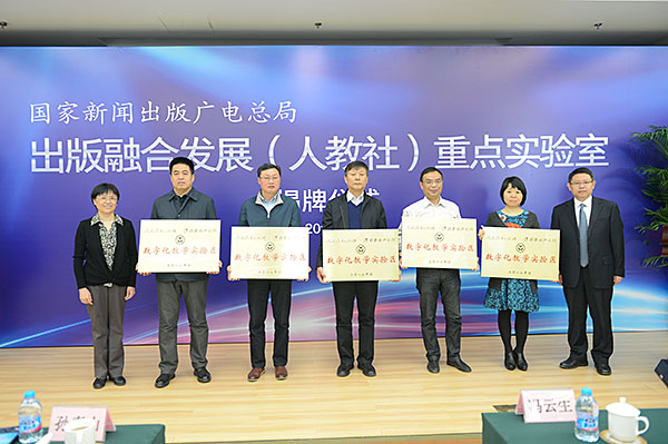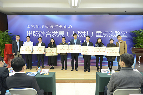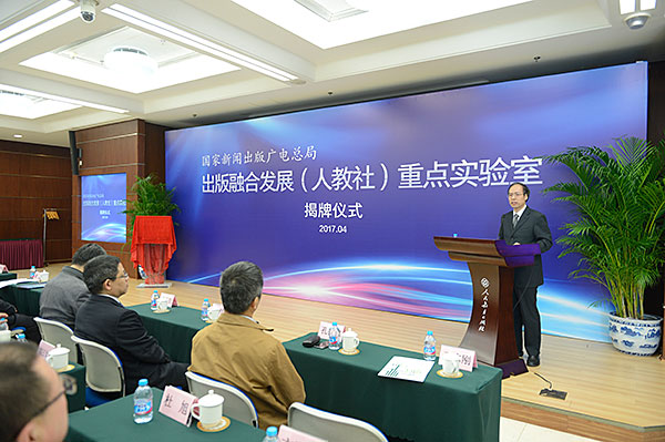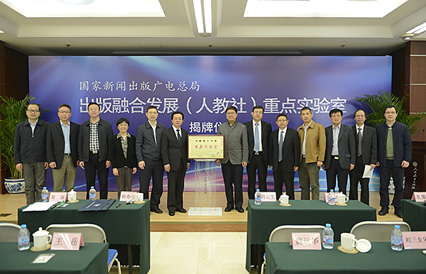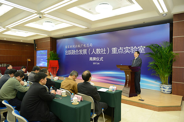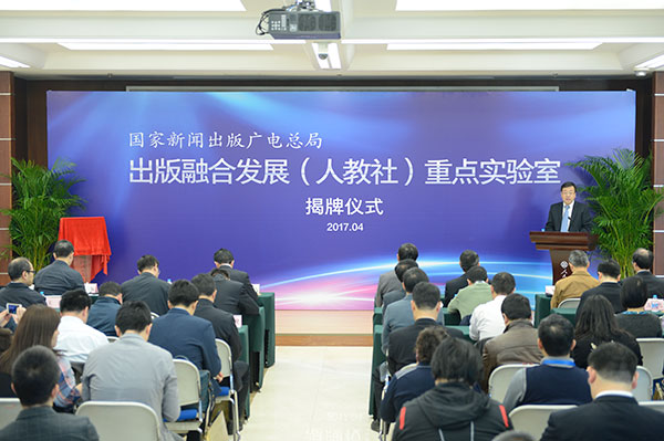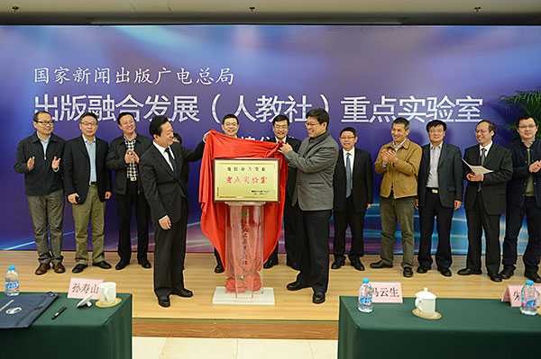 4月13日,国家新闻出版广电总局出版融合发展(人教社)重点实验室揭牌仪式在人民教育出版社举行。国家新闻出版广电总局副局长孙寿山,规划发展司司长朱伟峰、副司长孔德龙,中国教育出版传媒股份有限公司董事长冯云生出席仪式,共同为出版融合发展(人教社)重点实验室揭牌。出席揭牌仪式的还有实验室共建单位华中师范大学校长杨宗凯、人教社领导以及相关部门负责人70余人。人教社副社长王志刚主持揭牌仪式。