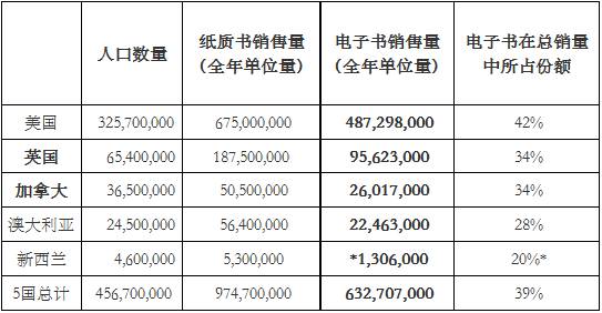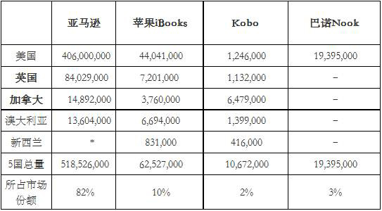 *因新西兰没有当地的Kindle Store,上表中其电子书销售总量仅包括Apple Store和Kobo Store,新西兰人通过亚马逊主网Amazon.com购买的Kindle电子书被计入了美国市场销量中。