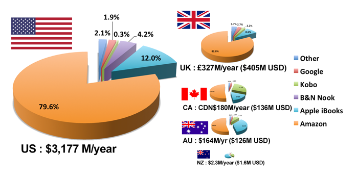 不过,亚马逊在新西兰和澳大利亚卖了多少电子书并不好统计,如数字出版媒体The Passive Voice指出的:有关澳大利亚市场的统计结果也许有些偏差,因为在当地的电子书零售商出现之前,很多读者是Amazon.com的顾客,他们没有转向Amazon.com.au网站。