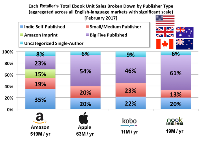 Author Earnings三月份发布的一份市场报告聚焦五大英语电子书市场——美国、英国、加拿大、澳大利亚和新西兰,研究了这些市场上15家最大的电子书零售店的市场份额。