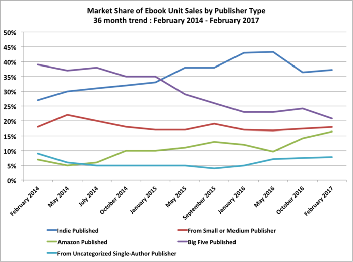 五大英语市场电子书年度总销量(截至2017年2月,包括自出版图书)