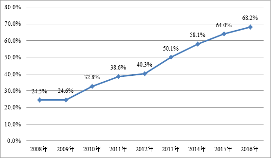 受数字媒介迅猛发展的影响,2016年我国成年国民数字化阅读方式(网络在线阅读、手机阅读、电子阅读器阅读、光盘阅读、Pad阅读等)达到68.2%,较2015年的64.0%上升了4.2个百分点。
