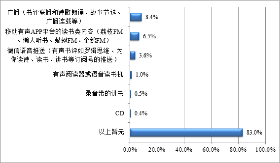 有8.4%的国民接触过广播(书评联播和诗歌朗诵、故事节选、广播连载等),6.5%的国民接触过移动有声APP平台的读书类内容,3.6%的国民收听过微信语音推送的内容,1.0%的国民使用有声阅读器或语音读书机。