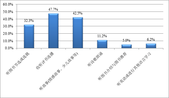 从听书内容来看,在有过听书行为的国民中,有47.7%的人选择“收听评书联播”,有42.5%的人选择“听故事(情感故事、少儿故事等)”,32.3%的人选择“听图书节选或连载”,11.2%的人选择“听诗歌朗诵”,6.2%的人选择“听英语或进行其他语言学习”,5.0%的人选择“听图书介绍与图书推荐”。