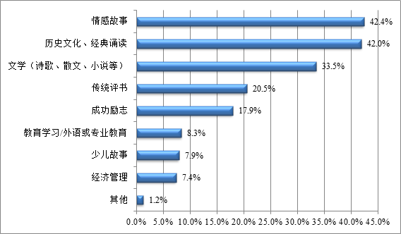 从听书偏好来看,在有过听书行为的国民中,有42.4%的人喜欢的内容类型为“情感故事”,42.0%的人喜欢“历史文化、经典诵读”,33.5%的人喜欢“文学(诗歌、散文、小说等)”,20.5%的人喜欢“传统评书”,选择比例均超过20.0%。