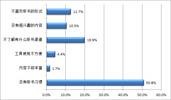 当问及不听书的原因时,没有听书习惯是首要原因,超过一半的人(50.8%)选择这一选项,还有19.9%的人“不了解有什么听书渠道”,12.7%的人“不喜欢听书的形式”,10.5%的人认为“没有感兴趣的内容”。