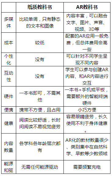 通过前面展示的AR教科书案例,可以总结出传统纸质教科书和AR教材的特性比较表: