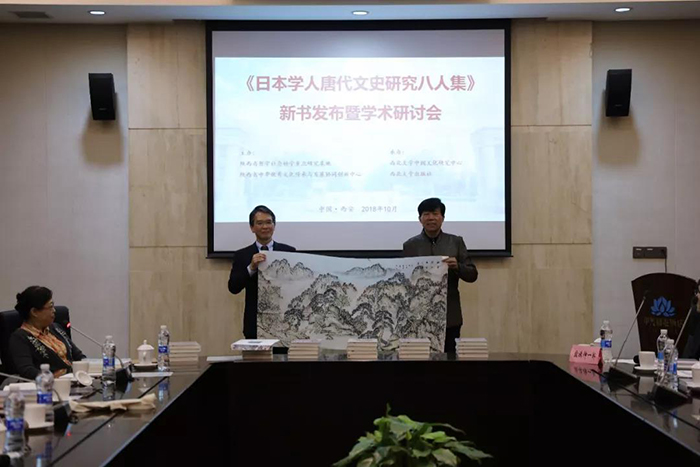 10月21日,《海外中国研究书系·日本学人唐代文史研究八人集》新书发布暨学术研讨会在西安召开,会上,著名画家闫军平向日本专修大学松原朗教授赠送画作。