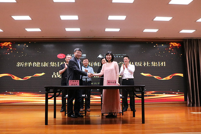 广西师范大学出版社集团公司党委书记、董事长张艺兵与新绎健康副总经理、 七修书院院长张杏兰分别代表双方签署了战略合作协议