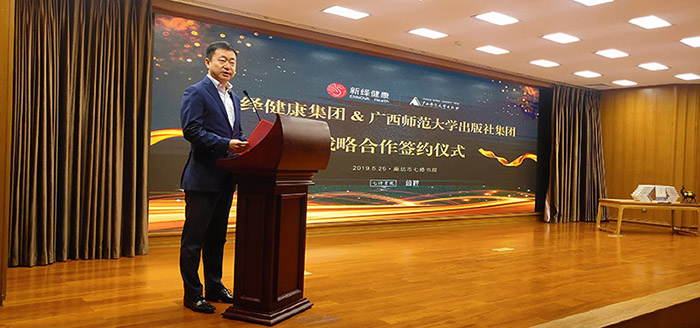 广西师范大学出版社集团公司党委书记、董事长张艺兵在致辞中表示,广西师范大学出版社作为具有成熟的完整产业链的跨国出版集团,已全面开启国际化发展战略,成为中国出版走出去的代表性企业,形成了跨地域、跨领域发展的新格局。广西师范大学出版社集团公司出版了一大批高水平的精品图书,打造了一系列具有代表性和影响力的文化品牌,以立体化、多形态的出版传播方式积极传播正能量。新绎健康作为新奥集团的子公司,秉承了新奥集团“提升人民生活品质”的发展理念,以中国传统医学和现代科学为基础,通过七修健康养生体系引导现代人的日常生活,七修书院专业而富有创新的团队立志成为弘扬中国传统文化的品牌标杆,立意高远,表现非凡,具有良好的发展前景。相信双方能以此次签约仪式为起点,建立长期战略合作关系,联手开创文化产业新局面。