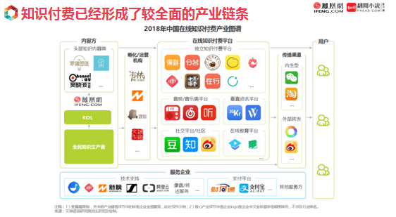 发展到2019年,知识付费行业已经形成了较为全面的产业链条。以罗辑思维和吴晓波频道等为主的头部内容方,将内容通过在线知识付费平台,传播给用户。这里的在线知识付费平台包括几种类型,一是以得到、在行、十点课堂为代表的独立知识付费平台;二是喜马拉雅、懒人听书等以音频为主的知识付费平台;三是36氪等垂直类的资讯平台;四是以社交为主的平台,如豆瓣、知乎live、微博等;五是在线教育平台,如新东方在线的知识付费课程。知识付费内容的传播渠道也分为两种,内生型和外部转发,如通过朋友圈、微博等触达用户。