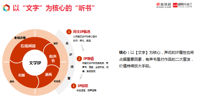 以文字为核心的听书,是什么意思呢?凤凰互娱是一个以文学IP为核心公司。旗下有3000部全版权文学作品、3000余位签约作家。文学IP是核心竞争力。这些文学IP怎样能衍生出除了在线阅读之外的价值?凤凰互娱尝试有声书、漫画,以及一些演绎和全IP开发。