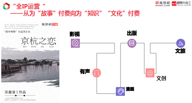 策略二:“全IP运营”——从为“故事”付费向为“知识”“文化”付费。用户不仅仅是为了故事付费,也要为了故事中的文化价值付费。以《京杭之恋》项目为例,这是凤凰互娱的一个文学IP,在影视方面,与欢娱影视(于正工作室)合作影视开发;在有声书方面,与北京广播电台文艺频道合作,邀请艾宝良和晏积宣演播;将其中关于传统文化的元素提炼出来,进行漫画二次衍生;与江苏凤凰文艺出版社合作,纸质书将于今年上市;并计划在文创和文旅层面再次深耕,打造京杭大运河沿线的文旅项目。IP运营是一个深耕过程。凤凰互娱希望把故事转化成知识和文化,并使得用户愿意为此付费。