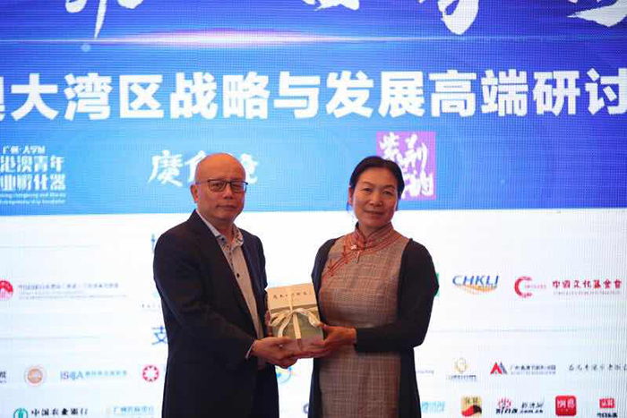 清华大学出版社紫荆文化传播研究中心秘书长杨爱臣向粤港澳青年创业孵化器发起人陳健文先生赠送清华大学出版社出版的《岭南文化研究》,她说:岭南文化是中华文化重要组成部分。岭南文化基于独特的环境和历史条件,在发展中汲取中原和海外的文化,形成了鲜明的特色。粤港澳大湾区的发展必将振兴岭南文化,为岭南文化的发展提供更加丰厚的土壤。此次应陳健文先生之邀参加本次论坛,感到十分荣幸,愿深入探讨,携手共进,为大湾区的建设贡献我们的力量!