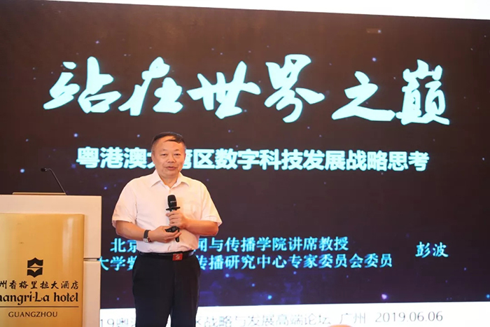 北京大学新闻传播学院讲席教授、国家互联网信息办公室原专职副主任彭波率先讲述了《站在世界之巅——粤港澳大湾区数字技术战略思考》,就粤港澳大湾区未来数字技术如何跟世界接轨,引领信息革命之潮流,发挥先行示范和辐射拉动作用等进行了解读。
