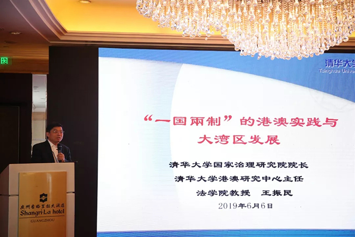 清华大学国家治理研究院院长、香港中联办前法律部部长王振民讲述了《一国两制的港澳实践和大湾区的发展》,对“一国两制”港澳实践经验进行总结,就如何打造法律湾区,解决协调大湾区合作发展中的问题进行解析。