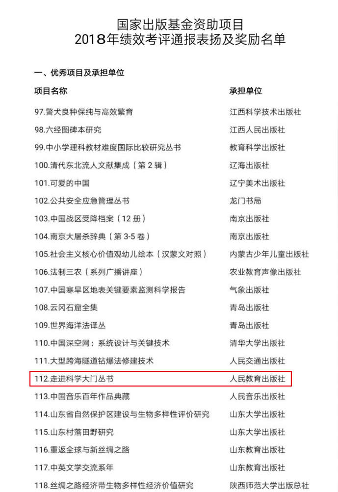 日前,国家出版基金规划管理办公室发布《国家出版基金资助项目2018年绩效考评结果通报》(基金办[2019]14号)。根据《国家出版基金资助项目绩效管理暂行办法》的有关规定,国家出版基金规划管理办公室组织专家对2018年357个已结项项目进行了综合绩效考评,对164个“优秀”项目承担单位予以表扬。人民教育出版社入选项目——“走近科学大门”丛书在出版质量、社会效益、项目管理等方面表现突出,与其他优秀项目及承接单位获得通报表扬。
