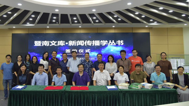 5月23日下午,“暨南文库·新闻传播学”丛书签约仪式于暨南大学第二文科楼郁文报告厅举行。暨南大学新闻与传播学院执行院长支庭荣、副院长刘涛和丛书作者,暨南大学出版社社长徐义雄、党总支书记兼副社长黄圣英、新闻传播事业部主任冯琳及有关编辑出席签约仪式。