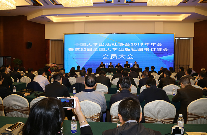 本网讯 11月4日上午,中国大学出版社协会2019年年会暨第32届全国大学出版社图书订货会会员大会在重庆召开。中宣部出版局图书处调研员王为衡、重庆市委宣传部出版处处长温相勇出席会议并讲话,重庆大学产业党委书记、资产经营公司董事长李嘉明出席会议并致辞,大学版协理事长、清华大学出版社社长宗俊峰,各大学出版社会员单位主要领导及代表和部分媒体出席了会议。大学版协副理事长、对外经贸大学出版社社长余兴发主持会议。