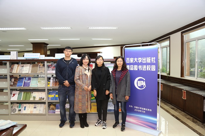 左二:浑燕珍(大学版协高校图书代办站服务中心副主任、秘书长,中国高校教材图书网副主任) 右二:谢爱芳(中国高校教材图书网业务主管) 左一:李然(中国高校教材图书网业务主管) 右一:江蕾(中国高校教材图书网编辑、第32届大学出版社图书订货会专版责任编辑)