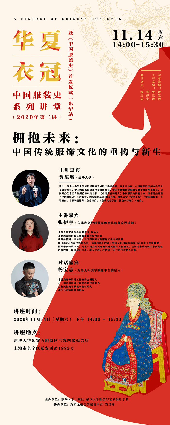 2020年第二讲我们将于11月14日在东华大学举行,届时我们邀请到了清华大学贾玺增副教授、东北虎高级时装品牌婚礼服首席设计师张伊宇女士以及万象无相美学赋能平台创始人杨宝志先生,为您一同解读关于“拥抱未来:中国传统服饰文化的重构与新生”,期待与您共享中国服饰文化的灿烂文明。