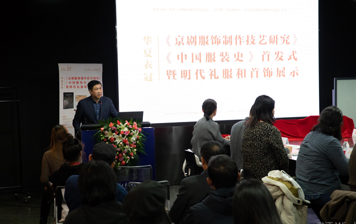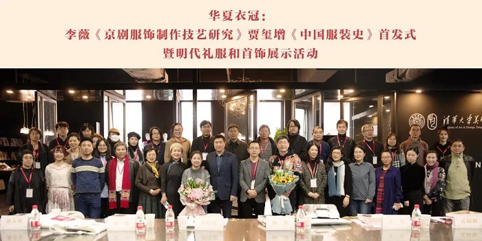 2020年11月27号,由清华大学美术学院染织服装艺术设计系与东华大学出版社主办的“华夏衣冠:李薇《京剧服饰制作技艺研究》与贾玺增《中国服装史》首发式暨明代礼服和首饰展示活动”在清华大学美术学院成功举行。来自故宫博物院、中国国家博物馆、中国妇女儿童博物馆、中国民族博物馆、中国服装博物馆、中央民族大学、江南大学、北京服装学院、北京理工大学、中华女子学院、北京邮电大学、中央戏剧学院、北方工业大学、北京舞蹈学院、汉帛国际集团、风陵渡金银器复原工作室、东北虎高级时装定制公司等40余位专家、学者、京剧服饰非遗传承人和设计师共同参与。活动在B站、当当、淘宝三大平台同步直播。