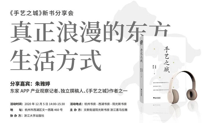 12月5日(星期六)下午,浙江喜马拉雅携手文新街道阳光新书房,邀请东家APP产业观察记者、独立撰稿人、《手艺之城》作者之一小雅为大家分享《手艺之城》背后“真正浪漫的东方生活方式”。