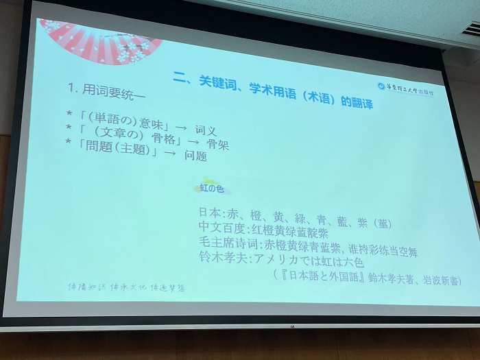 在这一部分,皮老师主要讲述了他翻译语言学著作时所坚持的一些原则,如忠实原文的文风,关键词、学术用语的翻译要保持全文统一,要尽量符合国内语言学界的相关用语或表述,尽量符合日常表述习惯等。皮老师特别讲解了日语词类命名及日语动词分类的问题,对目前国内较为流行的命名和分类方法做了反思。他告诉观众们,如果想要进一步提高自己的日语水平,想要做日语研究、读日语文献,那么最好掌握日本原本的词类命名和动词分类术语,而不使用为便于教学和记忆简化后的版本。观众们频频点头,对皮老师的建议表示赞同。