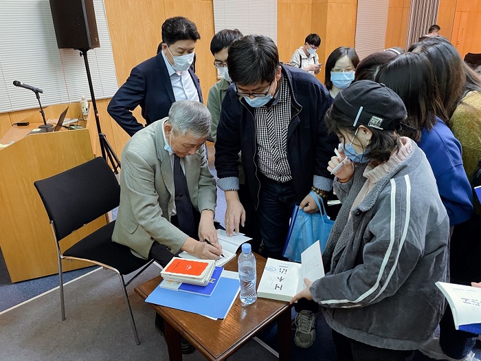 皮老师在介绍作者时,对其人物关系、研究成果、趣闻轶事了然于心,在分享翻译心得时引用了《古今和歌集》《源氏物语》等作品,可谓旁征博引;在讲解日语词类、动词分类等问题时,结合多年的教学、研究经验进行说明,台下日语专业的学生、老师都表示很有共鸣。 讲座结束后,是观众提问环节,观众们争相举手,提问的既有日语专业的在读学生,也有非日语专业的日语爱好者,还有皮老师几十年前的学生,已经退休的日语初学者等。提问的观众均获得了由华东理工大学出版社赠送的签名版《日本语》和《日语读写45问》。
