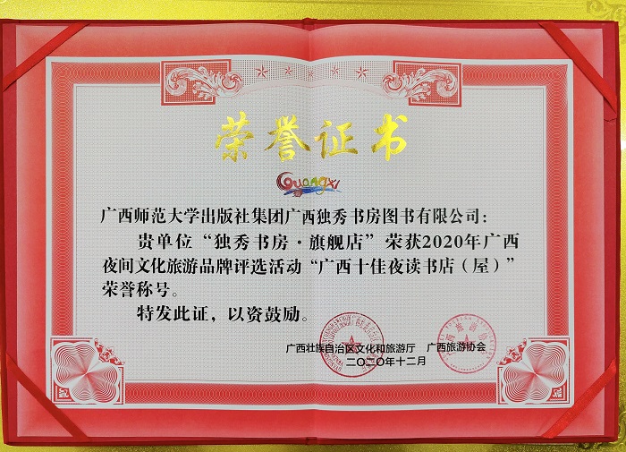 近日,广西旅游协会公布了“2020年广西夜间文化旅游品牌”入选名单,在广西十佳夜读书店(屋)类别中,独秀书房·旗舰店获此殊荣。据悉,本次“2020年广西十佳夜读书店(屋)”的评选旨在充分挖掘广西地区夜间文化旅游消费品牌,点亮城市的夜读之光,为广大读者朋友营造一个夜间阅读的良好氛围。