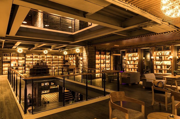 每当夜幕降临,这里灯光璀璨、活动汇集,满室的馥郁书香为书房增添了一份浓郁的文化底蕴。书房分3层而建,一楼陈列着丰富的图书选品,另有品质上乘的咖啡吧、简约舒适的阅读区及活动区等,在书房里拿起一本书,点上一杯热乎乎的饮品,即可度过一个美妙的夜晚;二楼是一楼空间的延展和补充,可供读者们读书办公、休闲聚会,在保证私密性的同时,又可将一楼的文化活动尽收眼底;三楼空间功能以小型沙龙和私人聚会为主,登上木质阶梯,读者们可在此独享一份静谧和书香。
