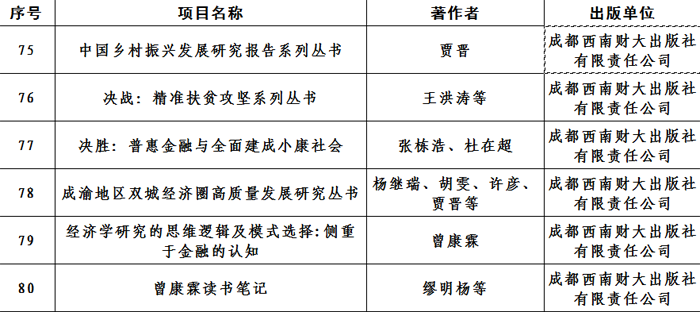 入选的6个图书出版项目是:“中国乡村振兴发展研究报告系列丛书”“决战:精准扶贫攻坚系列丛书”“决胜:普惠金融与全面建成小康社会”“成渝地区双城经济圈高质量发展研究丛书”《经济学研究的思维逻辑及模式选择:侧重于金融的认知》《曾康霖读书笔记》。