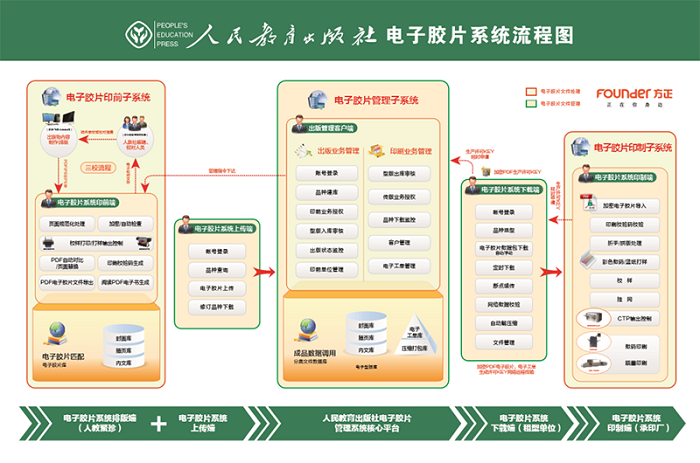 我社中小学教材远程传版管理系统是以电子胶片技术为基础,将ERP管理软件与互联网传输技术相结合,覆盖人教版教材排版、供型、生产印制全业务流程。其中,加密PDF电子胶片是指既具有实物胶片的全部生产特性与功能,又在电子文件传递、制版印刷和修订重印过程中确保图文内容不发生变化的加密PDF格式文件。