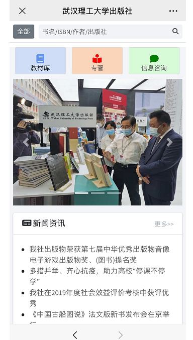 经过半年多的筹划设计和优化完善,武汉理工大学出版社市场营销手机移动端微官网正式上线运营。此次上线的“微官网”,以武汉理工大学出版社公众号为依托,内容涵盖武汉理工大学出版社出版教材和专著的全部信息,同时实时更新展示武汉理工大学出版社发展动态及出版行业资讯,设置了掌上书库、图书查询、样书申请、样章预览、新书发布、资源下载等功能,增加了新书推荐及热销排行等板块,力图更加全面细致的为广大读者提供优质服务。