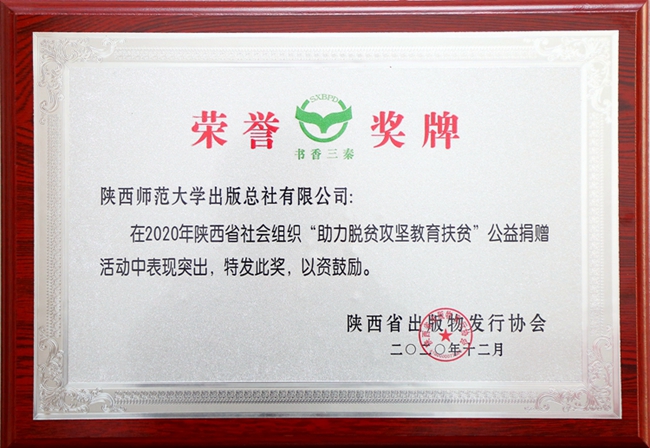 日前,陕西师范大学出版总社收到陕西省出版物发行协会颁发的荣誉证书和奖牌,表彰其在2020年陕西省社会组织“助力脱贫攻坚教育扶贫”公益捐赠活动中的突出表现。