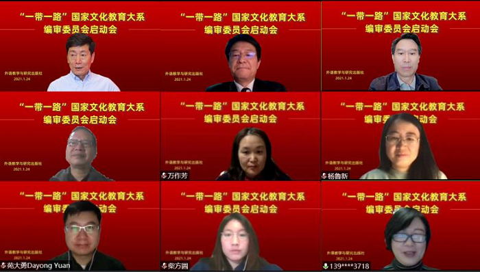 2021年1月24日,“一带一路”国家文化教育大系(以下简称“大系”)编审委员会启动会在线上顺利召开。外研社总编辑、大系编审委员会主任徐建忠,外研社副社长、大系编审委员会副主任刘捷,人民教育出版社编审石筠弢、刘真福,中国教育科学研究院研究员万作芳,北京外国语大学国际教育学院副院长杨鲁新、苑大勇,院长助理柴方圆,外研社期刊中心全体成员参加了本次视频会议。外研社期刊中心总监、大系编审委员会秘书长孙凤兰主持会议。