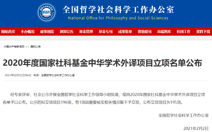 2021年2月2日,2020年度国家社科基金中华学术外译项目立项名单公布,共有195个项目立项。外研社此次有6个项目入选,其中包括3个重点项目,共涉及英语、俄语、日语、意大利语四个语种。其中,今年入选的《南京大屠杀史(俄文版)》为外研社与南京大学出版社的联合输出成果。