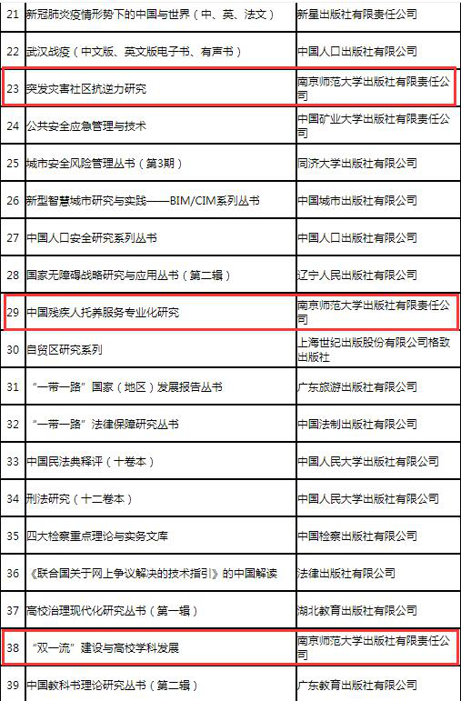 此次公示项目名单涉及马列、中国特色社会主义、中国精神,党史、新中国史、改革开放史、社会主义发展史,哲学、政治、经济、社会,艺术,文学、辞书,历史文化,自然科学、医药卫生,工程技术等八大类别,共计405项。其中,南京师范大学出版社组织策划申报的《突发灾害社区抗逆力研究》《中国残疾人托养服务专业化研究》《“双一流”建设与高校学科发展》从众多申报项目中脱颖而出,成功入选。