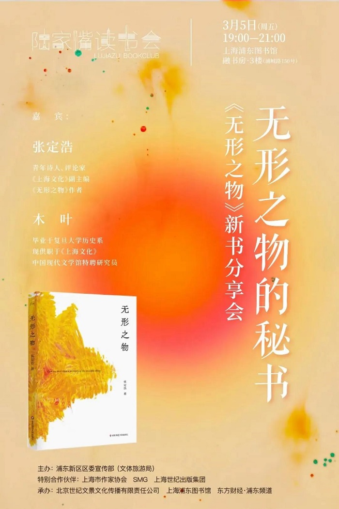 本周五,青年诗人、评论家,《上海文化》副主编张定浩携新作《无形之物》做客陆家嘴读书会,与《上海文化》编辑、中国现代文学馆特聘研究员木叶一起聊聊看似抽象无形却更为恒久坚实的领域。