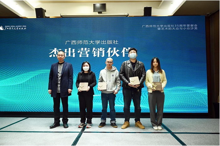 随后,汤文辉、姜革文分别代表广西师范大学出版社向各媒体、经销商代表颁发了“最具影响力合作伙伴”“最佳深度合作媒体”“最具传播力合作伙伴”“最具潜力合作伙伴”“品牌提升伙伴”“杰出营销伙伴”“精诚合作伙伴”“卓越学术推广伙伴”“创新销售伙伴”等9类奖项。