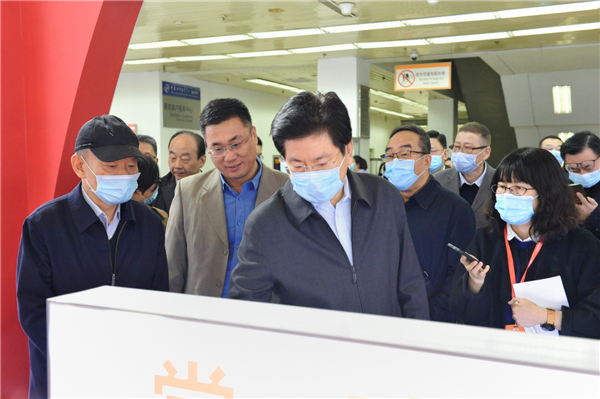 中宣部副部长张建春一行在北京图书订货会调研期间,观看人大出版社直播情况
