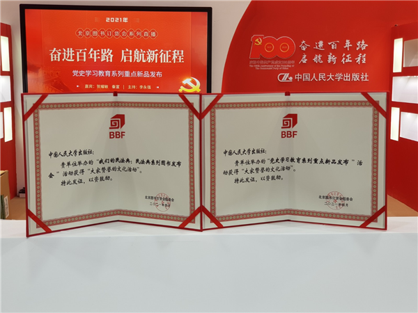 2021年3月31日至4月2日,第34届北京图书订货会在北京中国国际展览中心(老馆)成功举办。中国人民大学出版社“奋进百年路、启航新征程——党史学习教育系列重点新品发布”和“我们的民法典:民法典系列图书发布会”两场重磅直播活动,获评组委会的“大家赞誉的文化活动”奖。