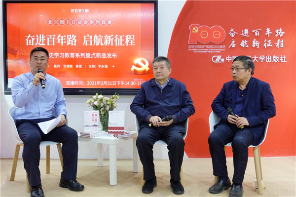 3月31日下午,人大出版社两位作者——中国人民大学原副校长、博士生导师贺耀敏教授,中国人民大学习近平新时代中国特色社会主义思想研究院院长秦宣教授,走进中国人民大学直播间,以“奋进百年路、启航新征程”为主题,开展了一场党史学习教育系列重点图书发布活动。人大出版社社长李永强主持了这场直播。